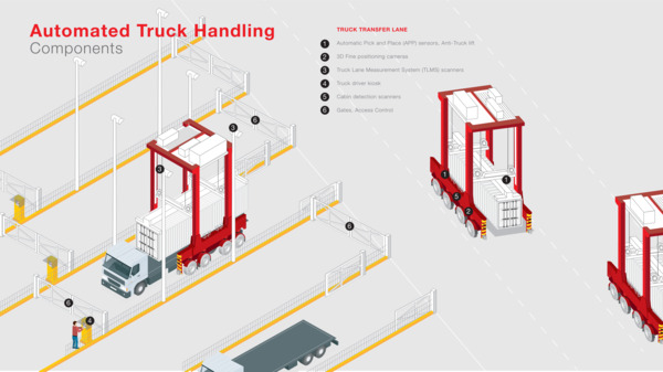 Automated truck handling improves the safety, predictability and cost-efficiency of terminal operations by eliminating the need for personnel to be present in the truck interchange zones. The system also automatically confirms the proper landing of the container on the trailer twistlocks, minimising the number of exceptions in the process and further increasing safety.