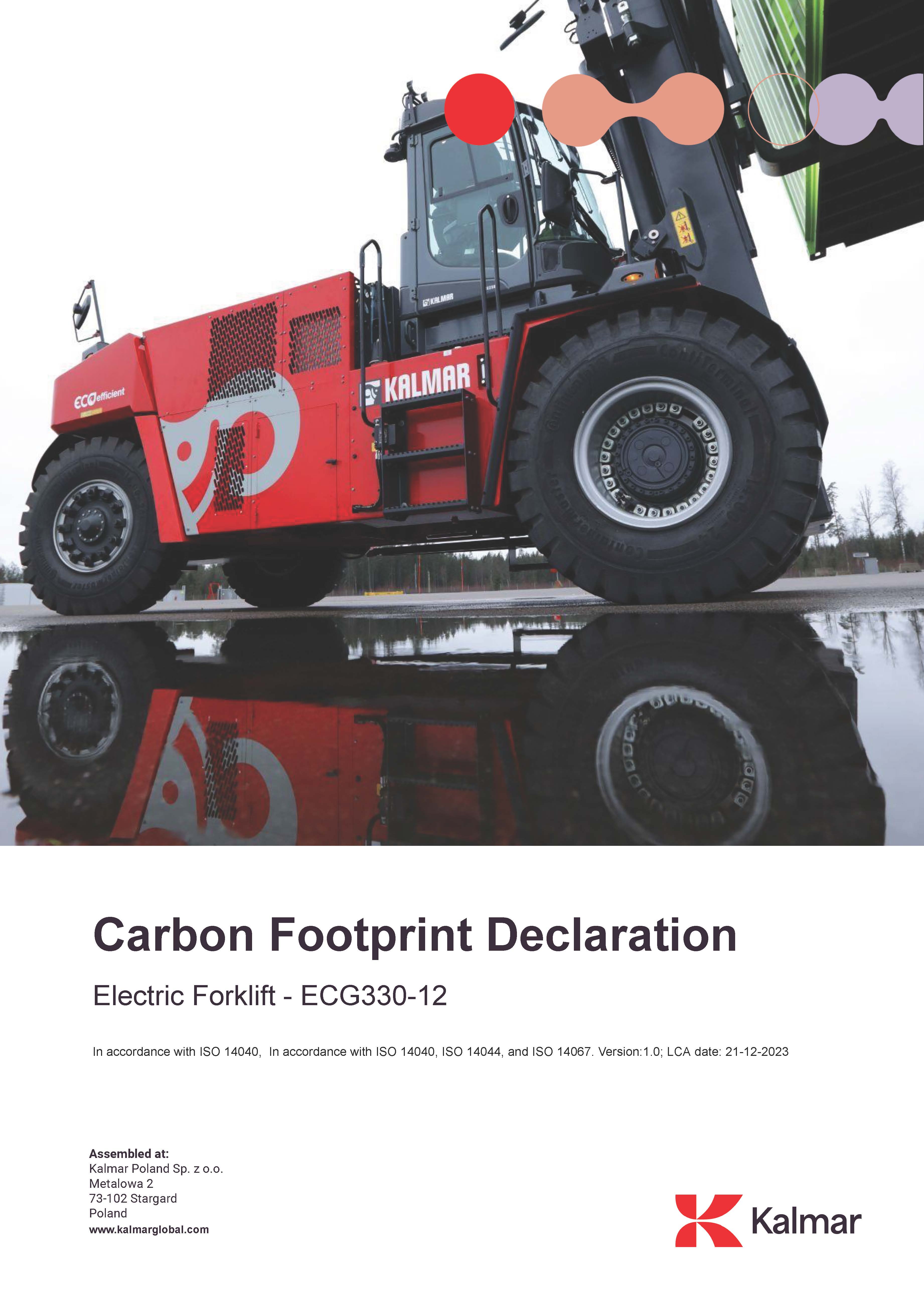 The Carbon Footprint Declaration (CFD) is a detailed document grounded in the ISO 14067 standard, designed to transparently present the carbon footprint of a Kalmar product. It serves as a streamlined and concise version of a product’s comprehensive Life Cycle Assessment (LCA), offering a clear overview of its environmental impact across its lifecycle.
