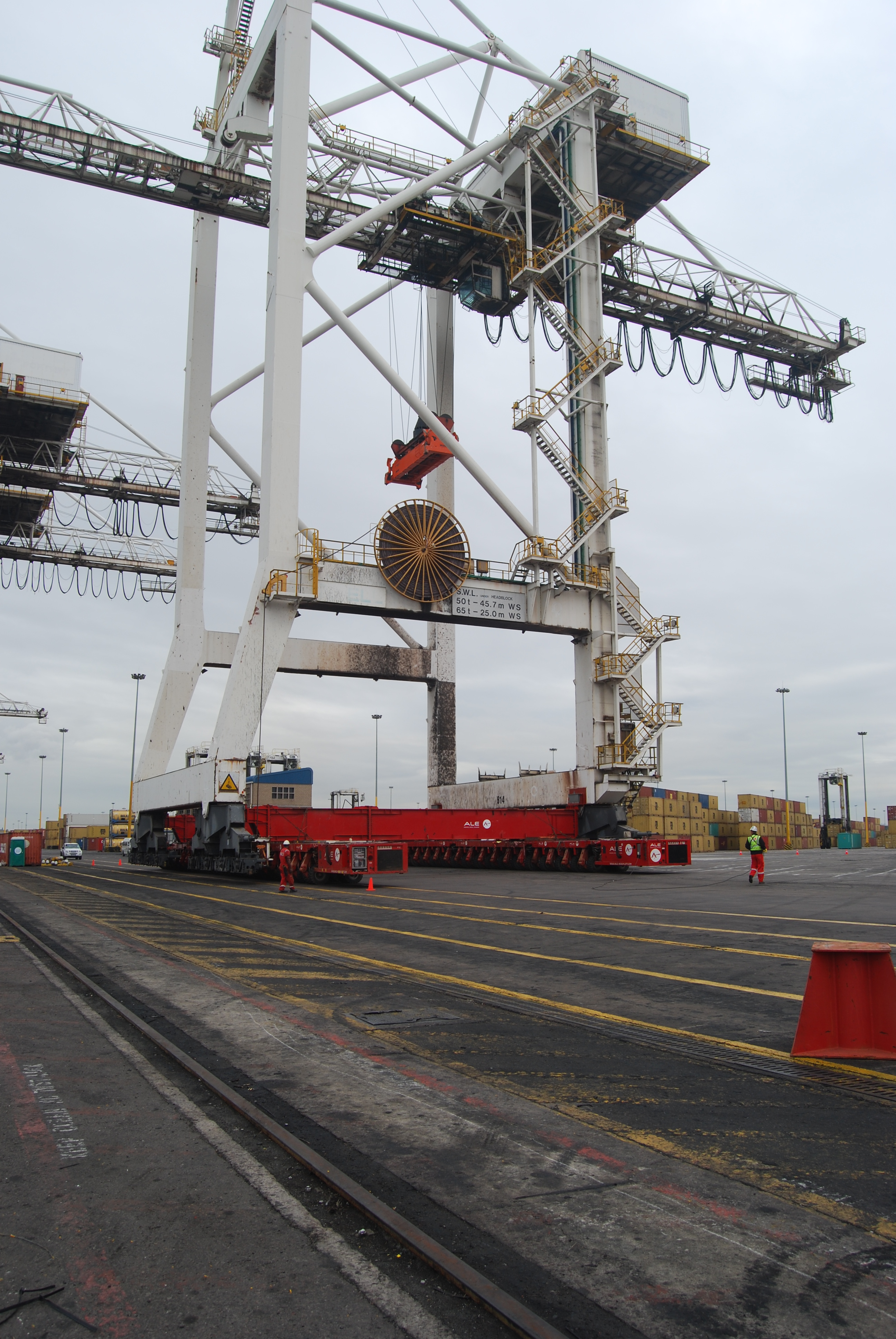 "The cranes had a transport bracket welded to each leg and are designed using finite elements analysis calculations by our engineering team. Once the transport beam was positioned, the transport platform hydraulic trailers suspended the weight of the crane, at which point real data was then compared with the original engineering calculations. This allows for any slight repositioning of the transport platforms in order to get the best position for the load distribution. The transport brackets do not affect the normal operation of the crane and can be left in position in case further relocation is required.