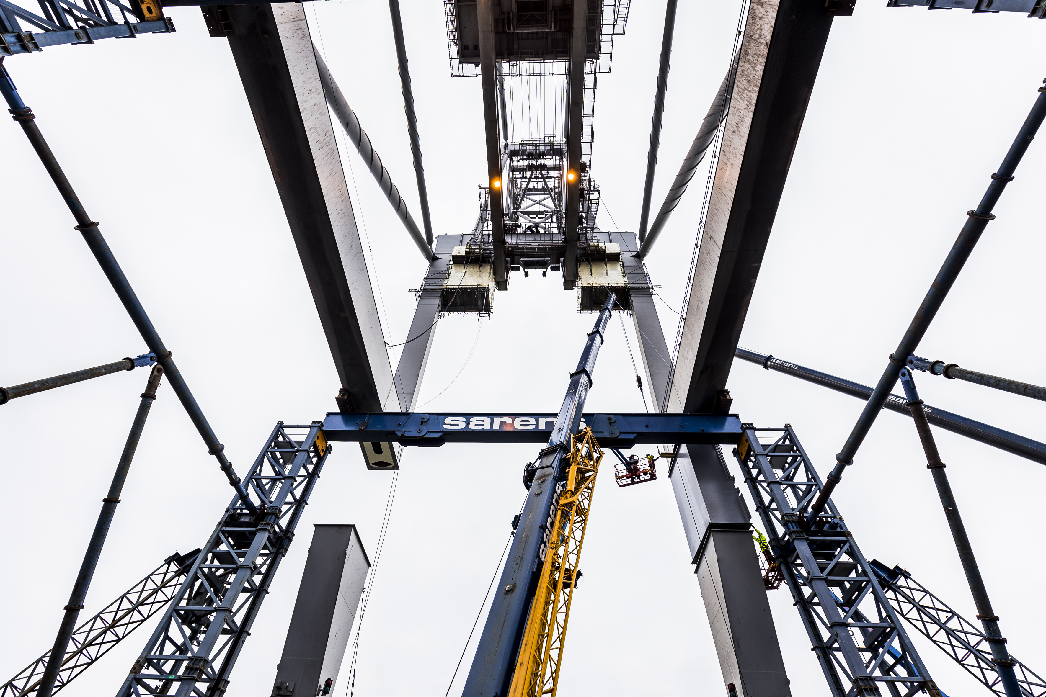 The cranes will be heightened by inserting leg extensions underneath the portal beams and installing bolted flange junctions in the existing welded crane leg construction. During the operation the cranes are jacked up using specialised jacking towers and hydraulic jacks. The project will also involve structural reinforcements in crane travel and trolley travel direction.